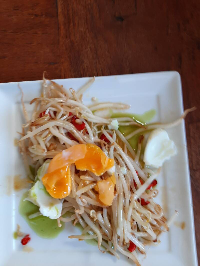 Tussen de gerechten door heeft Edwin ook nog zijn examen moeten doen, hetwelk hij met goed gevolg heeft afgelegd. Een prima gepocheerd ei maakte hij...... Chef en Souschef waren tevreden.
