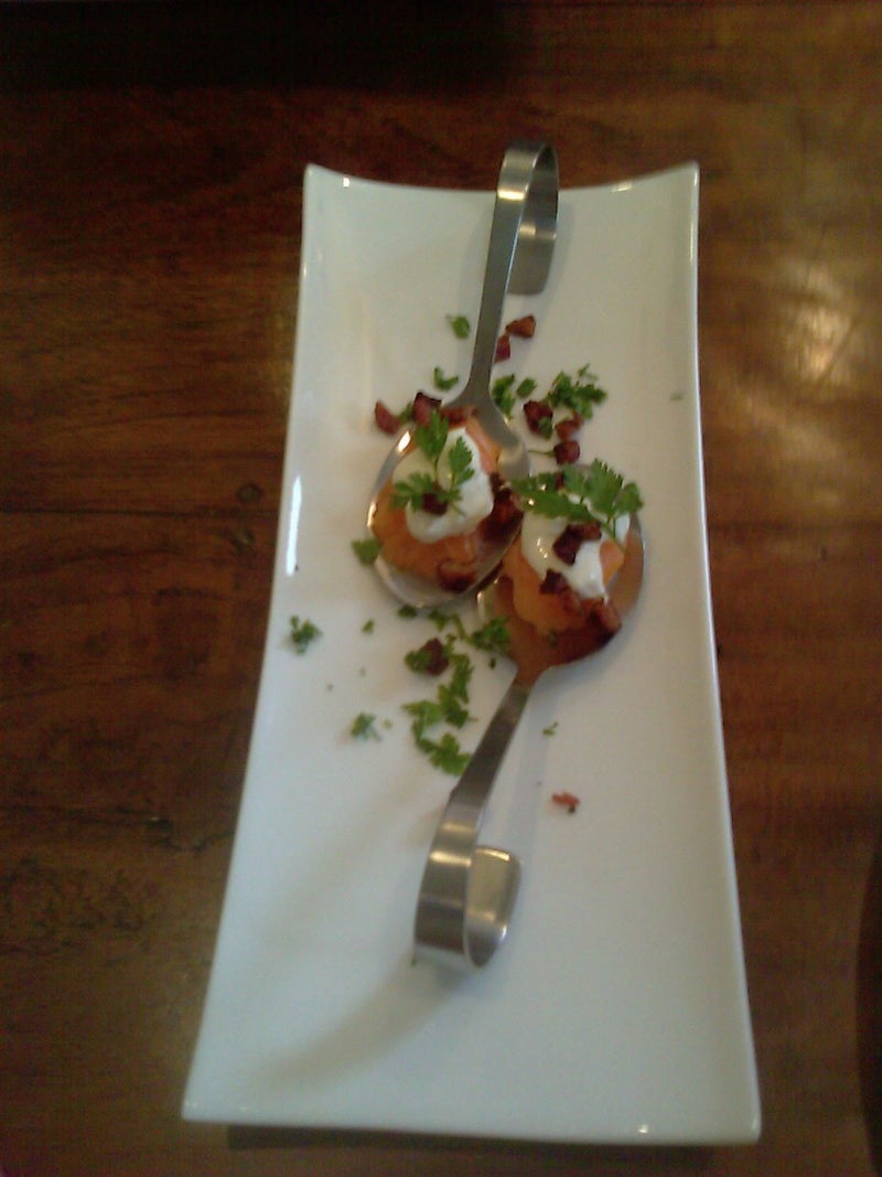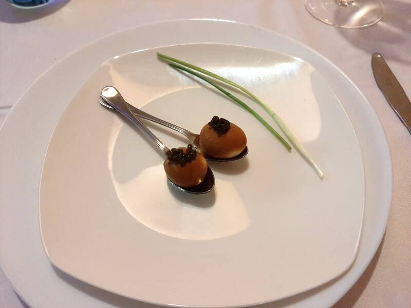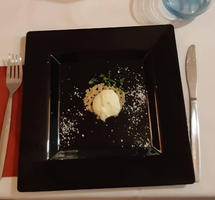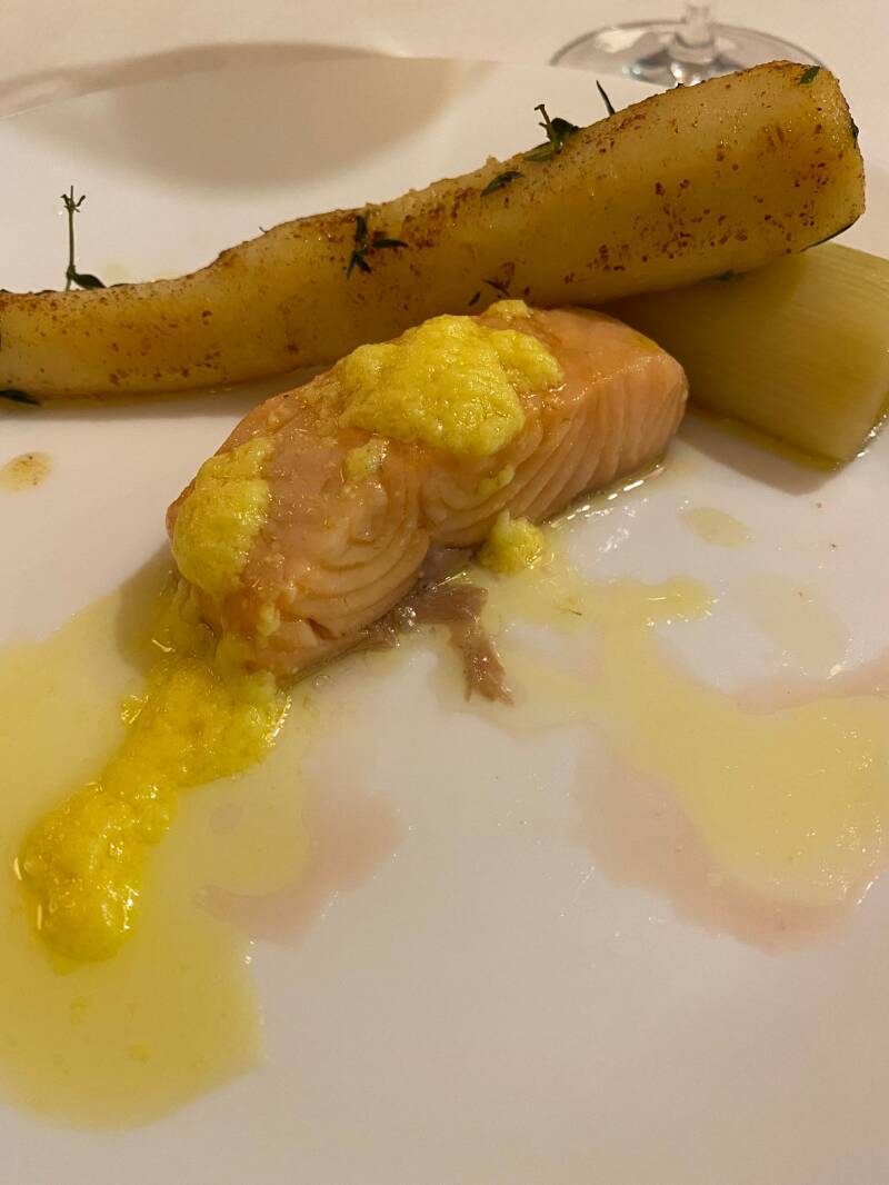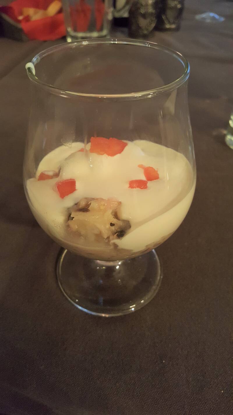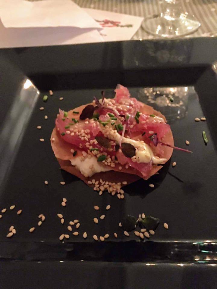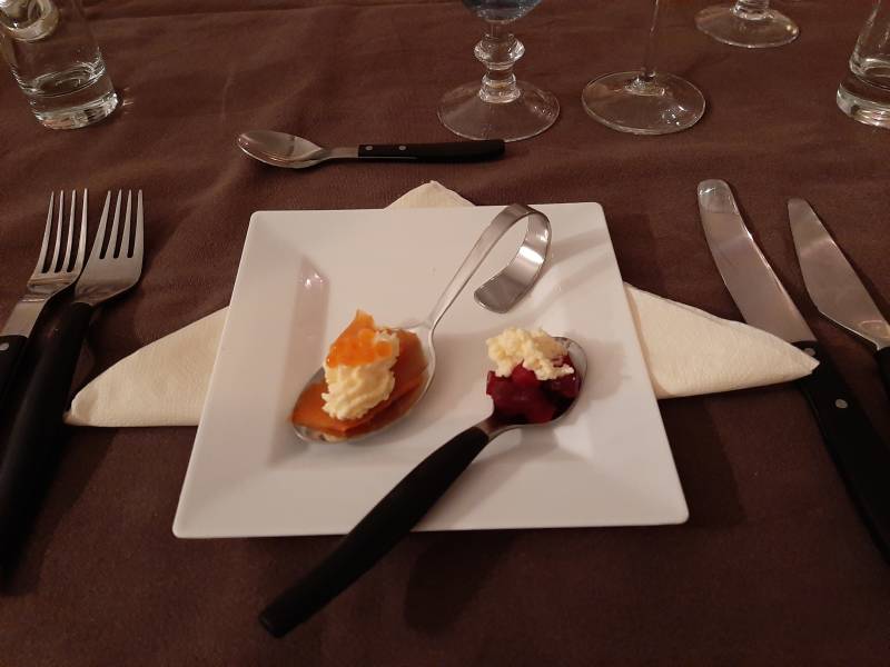 Amuse: Gerookte zalm met een crème van ei.