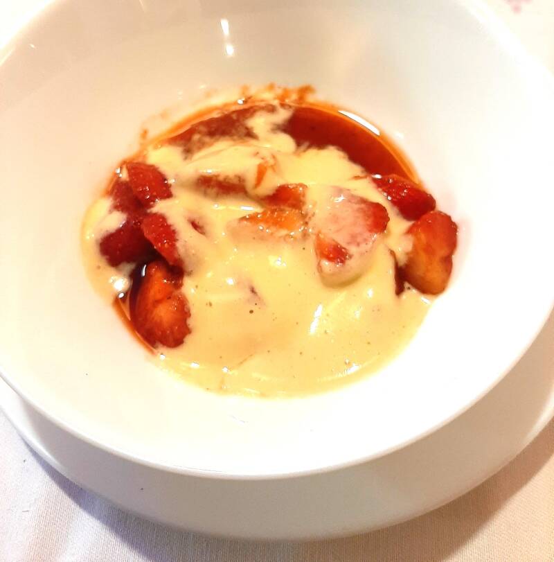 Kaneelappel met crème Anglaise en stroop.