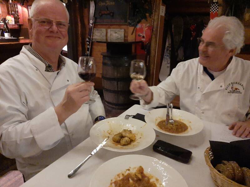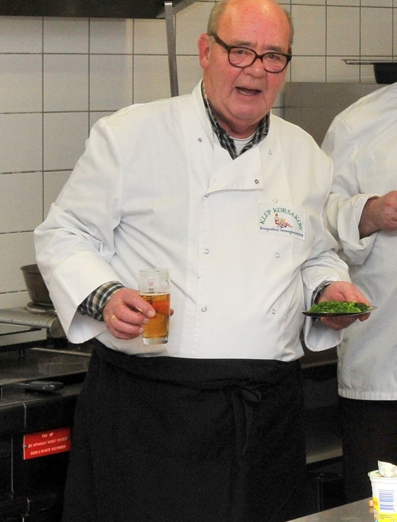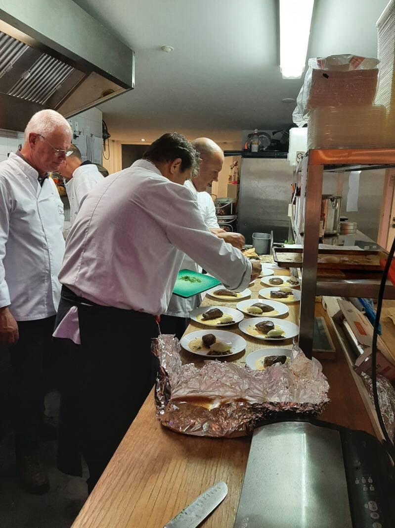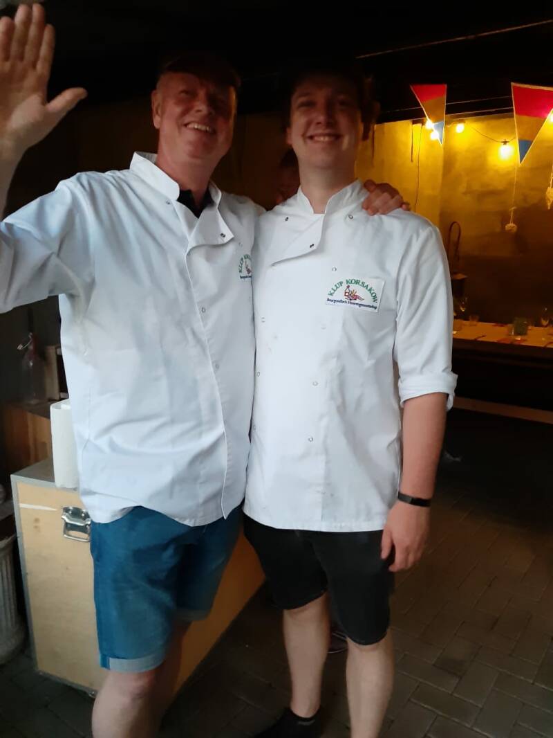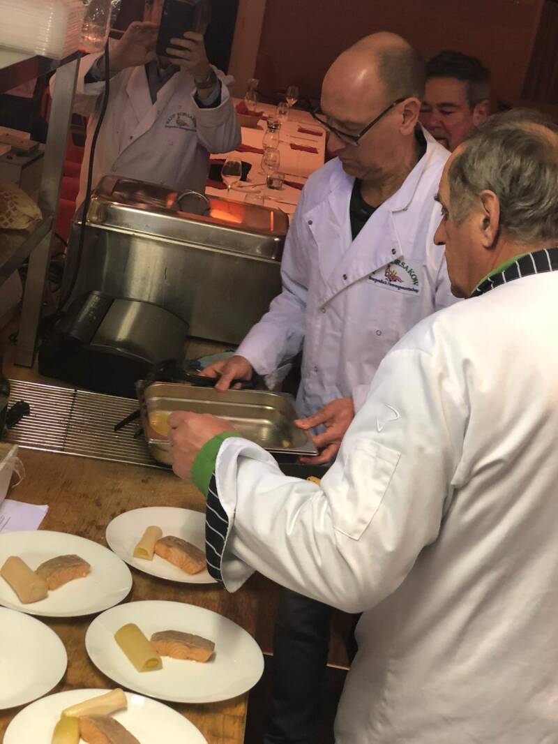 Foto boven, onze chef Herman bezig met de opmaak van het hoofdgerecht , Frans kan niet wachten op het hoofdgerecht