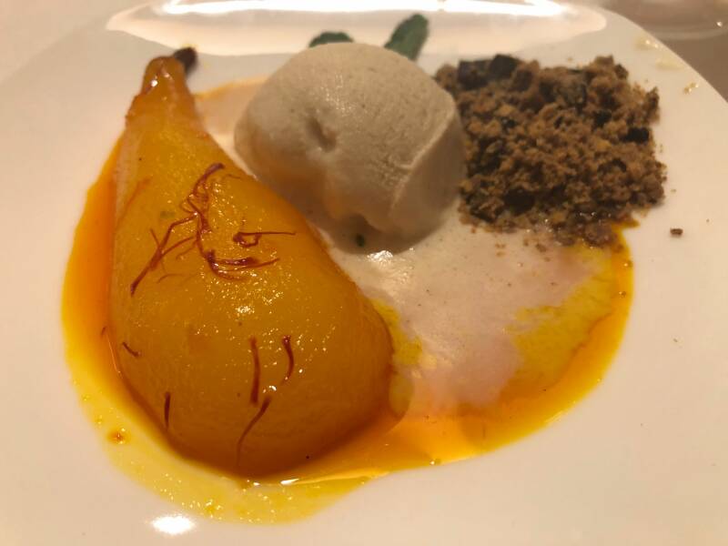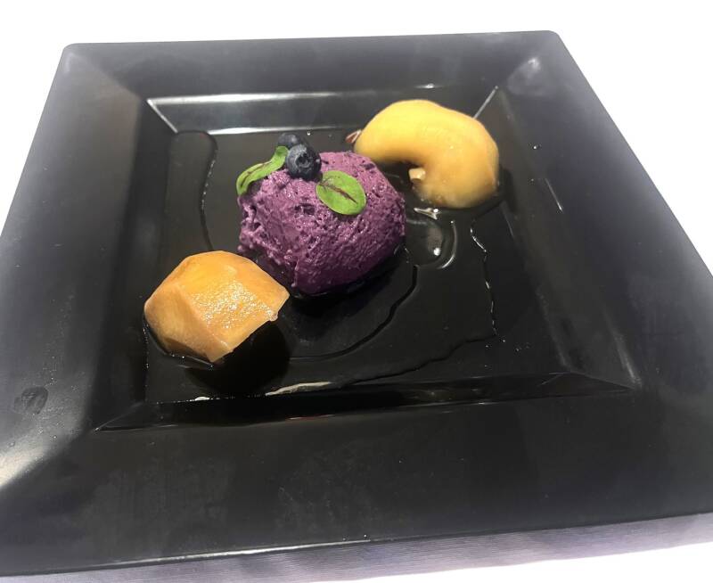 Perzik gepocheerd in bourbon en mousse van blauwe bes