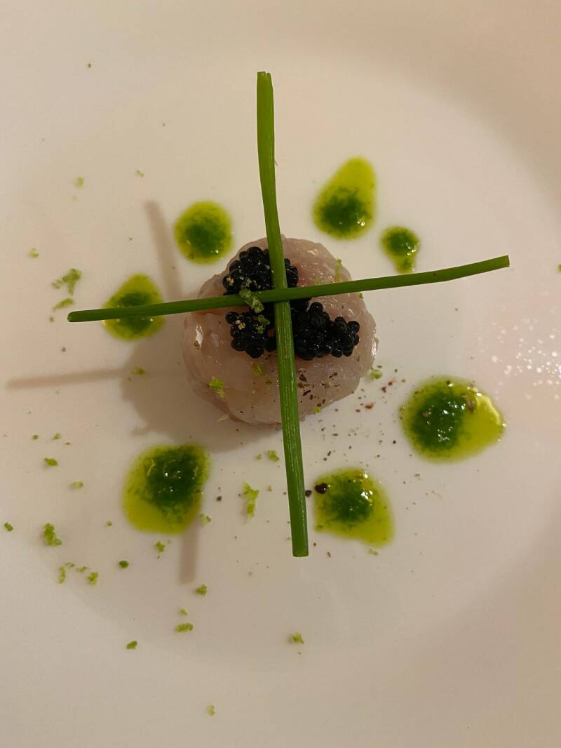 Voorgerecht: Kalfs-tartaar met Hollandse garnalen en kokkels.