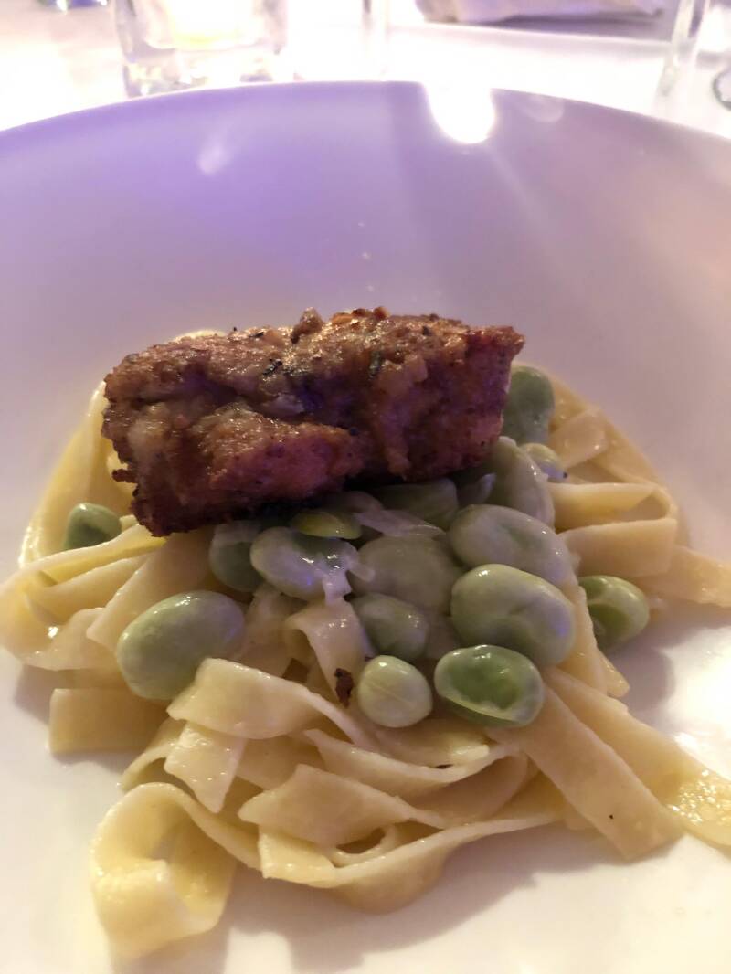 Spaghetti van Taugé met parmezaan en gepocheerd ei.