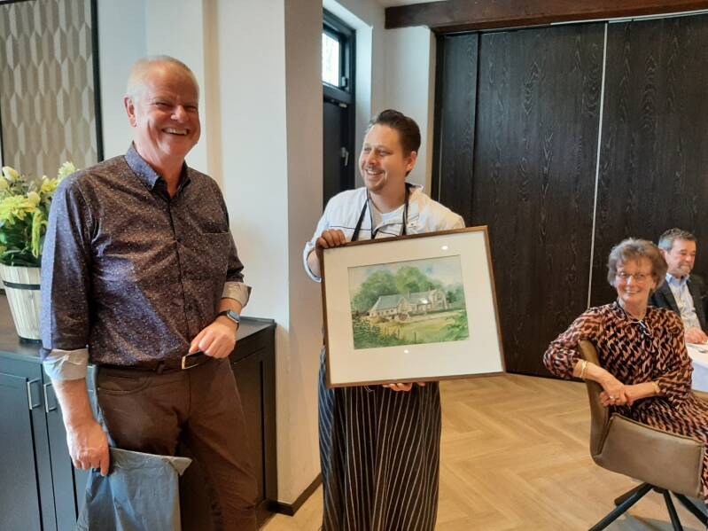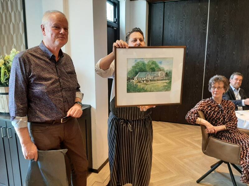 Hierboven een foto van de overhandiging van het schilderij van "De Hofstede" Gedoneerd door