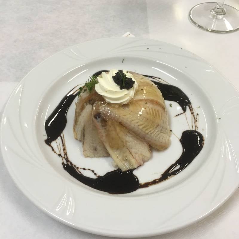 Garneer het geheel met een theelepel kaviaar en druppel er wat balsamico omheen.