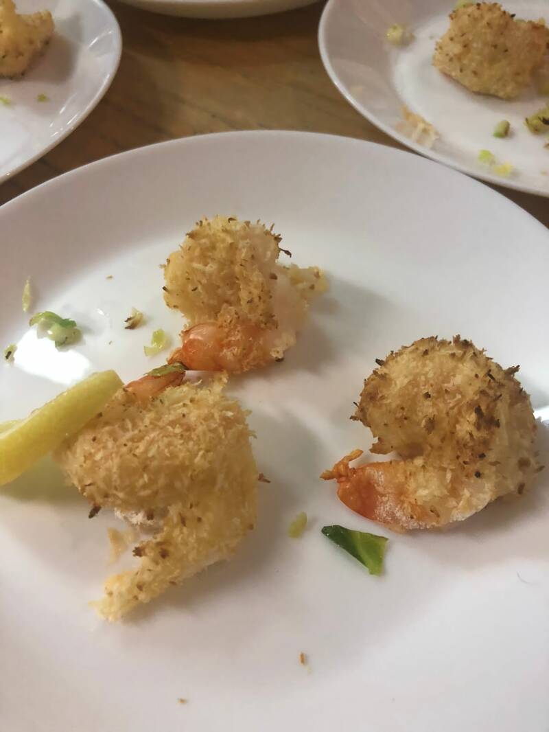 - Haal de gamba’s door de bloem, het geklutste ei en tot slot door het kokosmengsel.