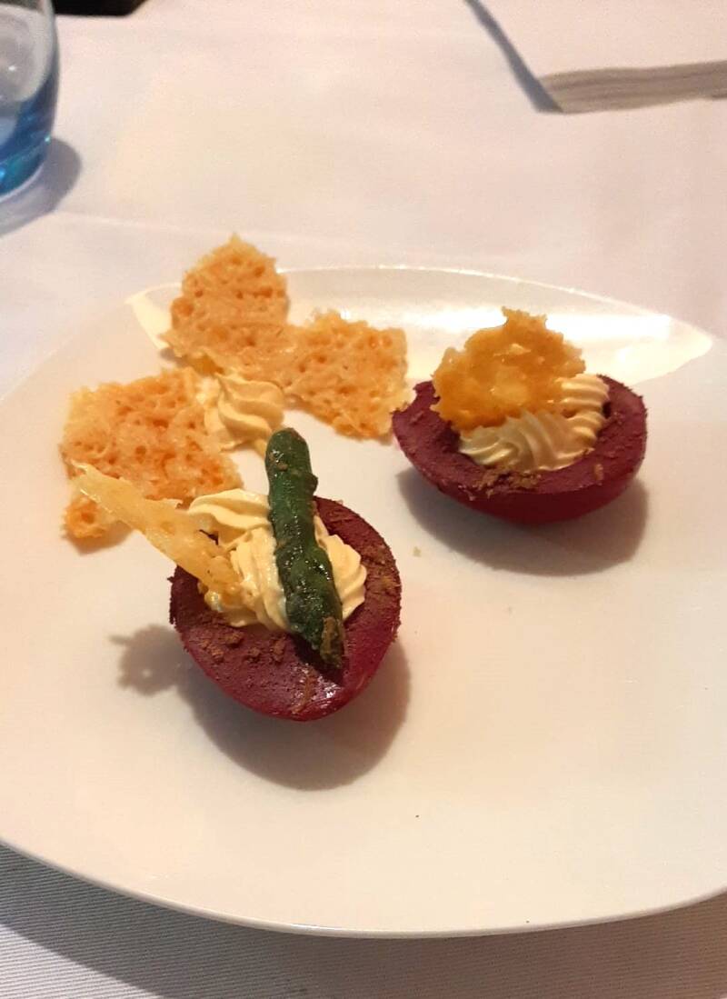 - Spuit er de dooiermassa in en steek er de stukjes kaaskoek in. Leg de groene asperges erop. Garneer met de cress