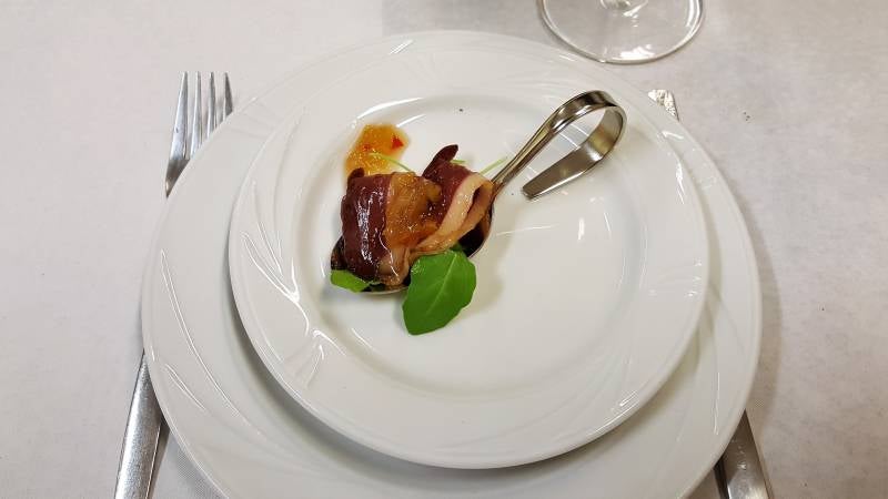 - Druppel voorzichtig op ieder plakje eendenborst een beetje van de mangochutney. Pas hier wel mee op, als je een scherpe chutney hebt overheerst de smaak al snel dus proef hem eerst goed voordat je het gebruikt.