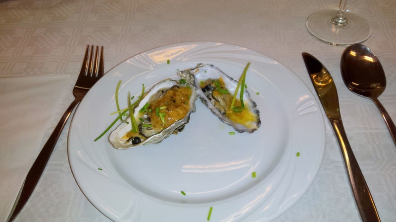- 2 oesters per persoon op een bordje serveren, gegarneerd met bieslook.