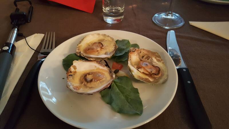 Gegratineerde platte oesters in champagnesaus