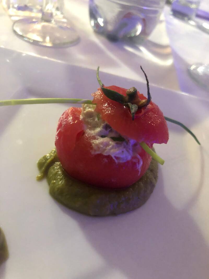 - Verdeel de erwtenpuree/saus over kleine bordjes en leg daar de tomaatjes op