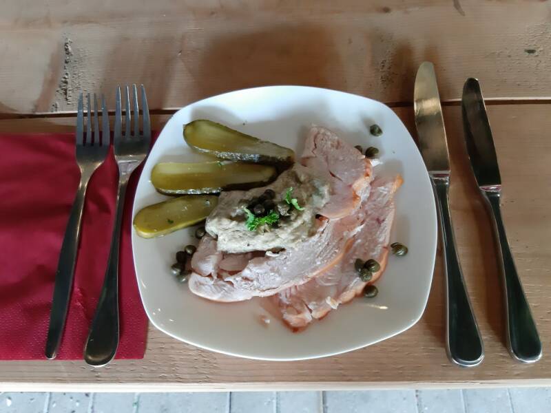 - Garneer met plakjes augurk, kappertjes en nog wat peterselie.