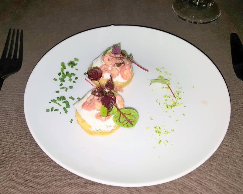 - Leg het parmezaankoekje op een bord, doe er een flinke lepel zure room op, een hoopje garnalen en daarboven de mengeling van cress