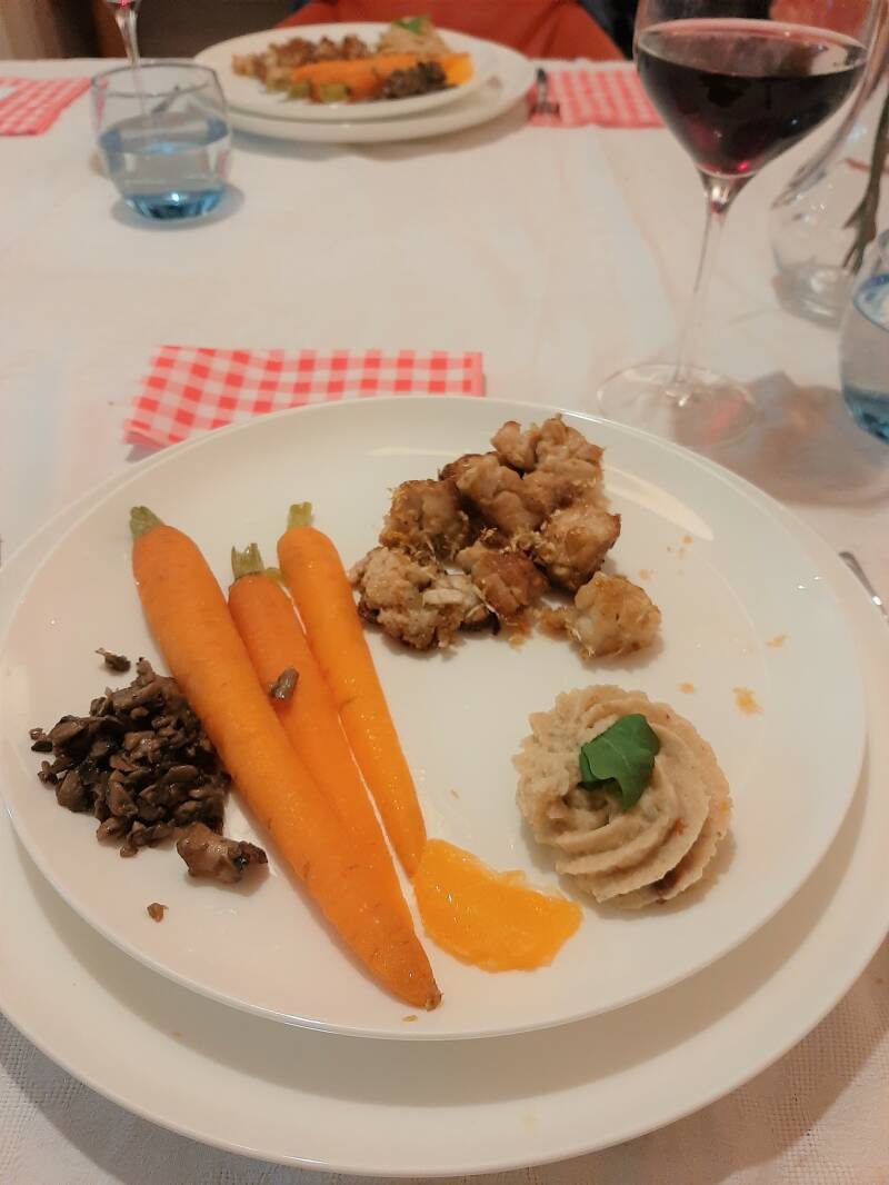 Kalfszwezerik gepaneerd met sinaasappelkruim, sous-vide gegaarde worteltjes, duxelles van champignons en puree van knolselderij en paddenstoelen