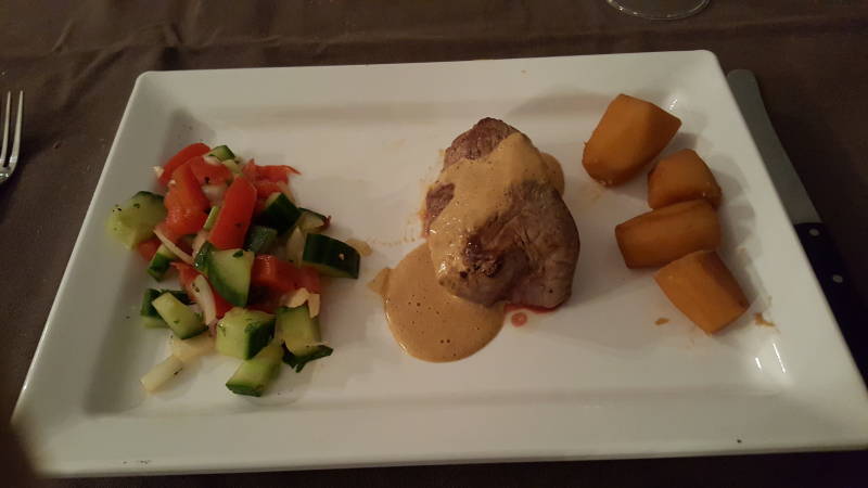 - Leg elke biefstuk op een bord, giet de ras el hanout-saus over de biefstuk en serveer met de pommes fondant en de salade