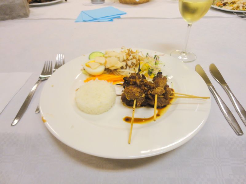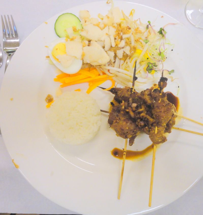 In het midden van het bord een omgedraaid kommetje rijst en rechts drie of vier stokjes saté met een of twee eetlepels saus.
