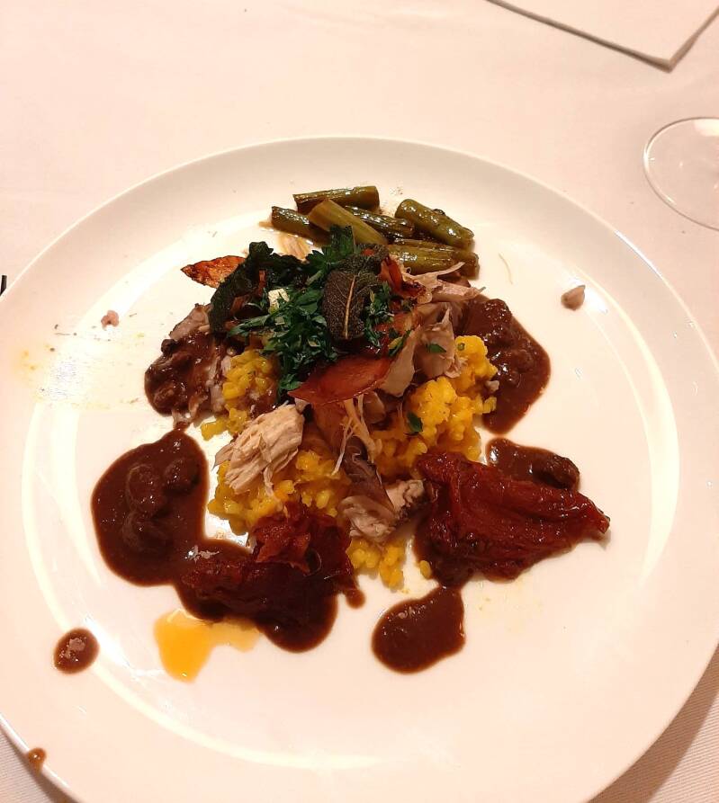 Leg op het konijn een stukje Serranoham en een theelepel gremolata