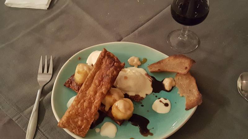 - Bouw de borden op met druppels van de twee sauzen, quenelles ijs en vanilleroom en de kruidkoekkruimels.
