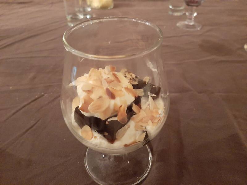 - Vul 12 glazen laag om laag met de stukjes koffiegelei en slagroom.