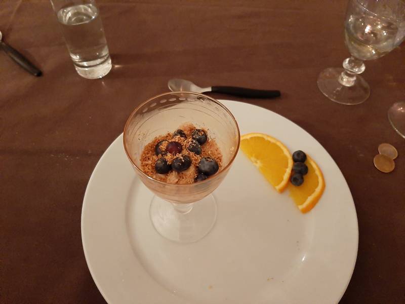 Garneer voor het opdienen af met de kokosrasp en blauwe bessen.