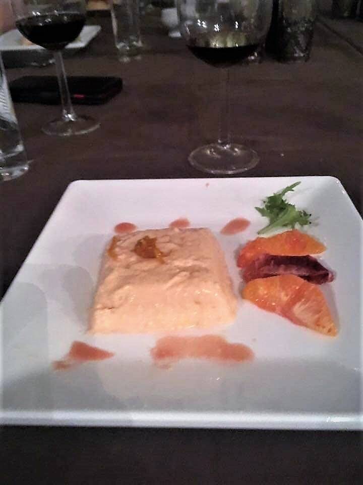 Leg aan de rechterkant de bavarois. Leg aan de linkerkant 3 partjes bloedsinaasappel. Leg de overgebleven zeste op de bavarois. Garneer het bord met enkele druppels sinaasappelsap.
