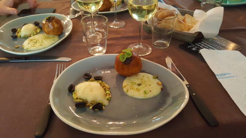 - Maak een quenelle van olijfolie-ijs op de gemalen nootjes en leg de overige olijven erbij.