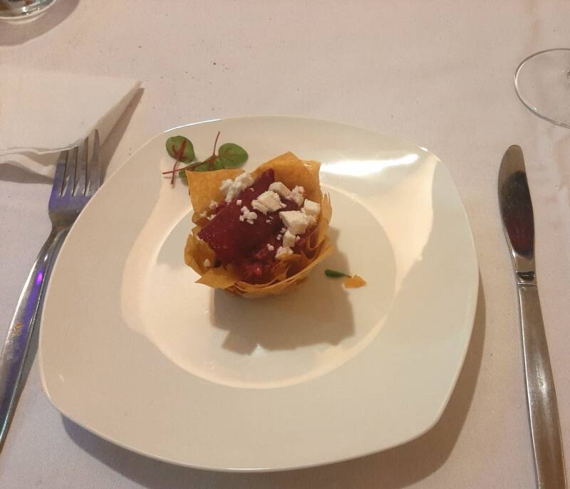 - Draai de ingelegde bietenplakjes tot een kegeltje en leg op ieder taartje en kegeltje