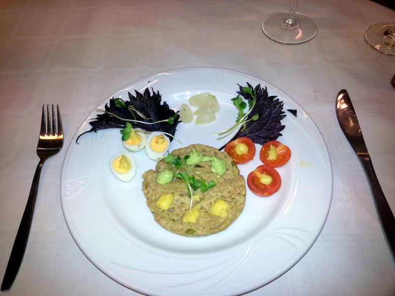 Tartaar van kalf met avocadocrème , zilveruitjes, kwarteleitjes kletskopje van Parmezaanse kaas en mayonaise met VOC specerijen.
