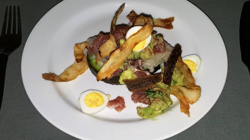 - Verdeel tonijntartaar, ingelegde daikon (even goed uitknijpen) en guacamole over de avocadohelften. Halveer de kwarteleitjes en zet ze op de avocado’s. Garneer met de daikonchips.